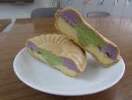 うんまかモナカは、紫いもと安納いもで大隅茶のアイスを挟み直径10センチほどのモナカの中に詰めています!